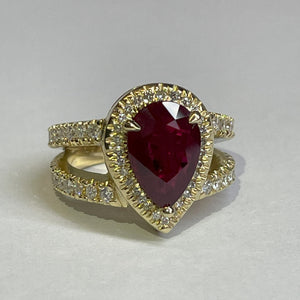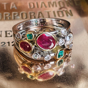 Fun and colourful, this ring has an assortment of rubies, diamonds and emeralds set onto a a three row split band. The use of colourful gemstones makes this piece especially versatile and great for any outfit.