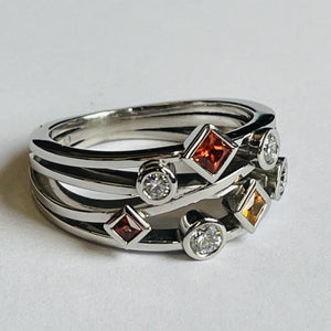 With a contrast of warm multicolour gemstones such as garnet and citrine against the cool toned platinum metal this playful ring features an assortment of different coloured gemstones in different cuts. Set onto four open and overlapping bands, the ring is a great example of modern jewellery