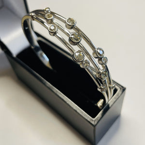 Inspired by our scattered diamond rings, this bangle matches perfectly to our the much loved and popular design that our customers love. An array of different sized diamonds are rub-set and seem to float on an open three-band bangle.