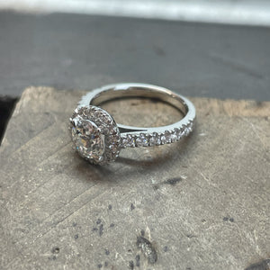 Our customer wanted as many diamonds as possible on their ring and we found this design featuring a halo of diamonds and pavé diamond band was the perfect option for them.