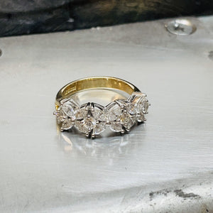 Made using stunning marquise diamonds, this wide dress ring resembles a four-point floral motif repeated across the front of the ring, giving it a feminine yet statement-like look.