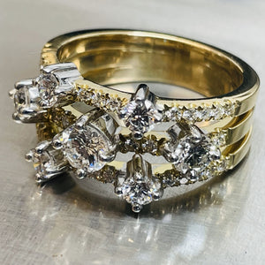 A set of three 18ct yellow gold and platinum bands feature an array of different sized round brilliant cut diamonds onto a pavé diamond band. Able to be worn individually or all together for a maximum sparkle look, we loved the idea behind this interchangeable ring set