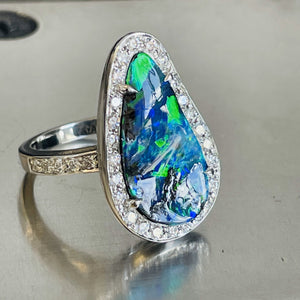 Working with the customers design, version and opal our design team and goldsmiths created this one-of-a-kind engagement ring. With a pierced out and intricate gallery and a surrounding of diamonds this piece had all our staff talking and eagerly awaiting the next showstopper ring we have the honour to make.