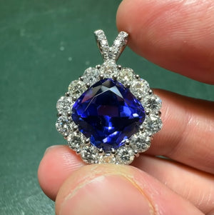 Reminiscent of the famous Titanic necklace, this tanzanite and diamond cluster pendant felt like a museum piece, with a huge vivid blue purple tanzanite being the star of the show and surrounded by fourteen round brilliant cut diamonds. Because you can never have too much sparkle, we added diamonds onto the split bail of the pendant too.